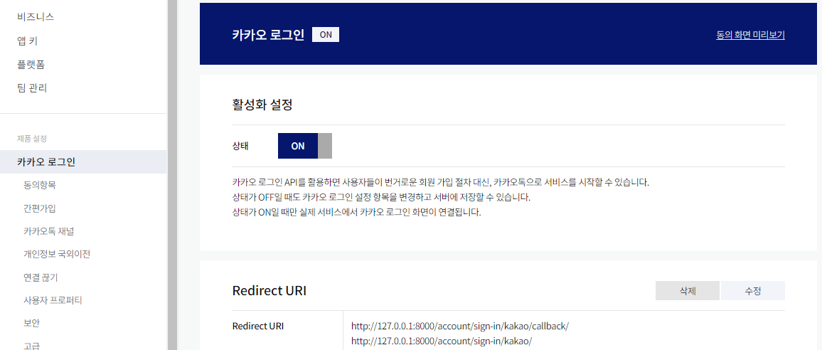 - 앱 키 생성 확인 후 카카오 로그인 활성화 + Redirect URI를 추가해 줘야함