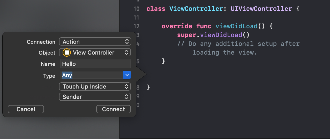 - button이 생성되면 해당 button을 ctrl을 누른채 클릭하여 코드로 드래그 시키면 아래와 같이 메소드가 자동 생성