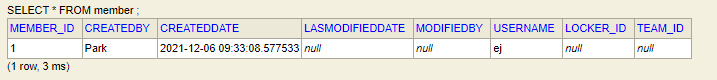 공통 매핑 정보가 필요할 때 사용한다.( id, name 과 같은 ) : DB 에서는 다른 컬럼이지만 객체에서 반복적으로 사용될때 ( 귀찮음을 줄이기 위한 것 ) 상속관계 매핑 불가. 엔티티, 테이블과 매핑이 불가하다 부모클래스를 상속 받는 자식 클래스에 매핑 정보만 제공한다. 조회, 검색이 불가(em.find(BaseEntity) X) 직접 생성해서 사용할 일이 없으므로 추상 클래스 권장 예시 ) 만약 Member와 Team 테이블에 생성한 사람, 생성날짜, 수정한 사람 , 수정 날짜 를 공통적으로 사용하고 싶다면? 1. BaseEntity 생성 package hellojpa; import javax.persistence.MappedSuperclass; import java.time.LocalDateT..