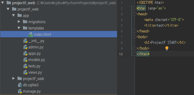: 위에서 생성한 app 디렉토리 하위폴더로 templates 를 생성 후 원하는 html을 생성합니다.