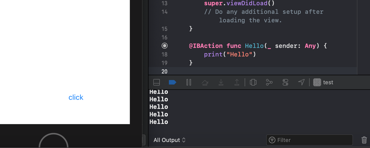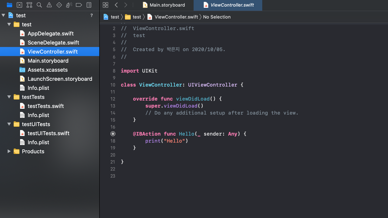 - button이 생성되면 해당 button을 ctrl을 누른채 클릭하여 코드로 드래그 시키면 아래와 같이 메소드가 자동 생성